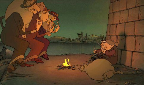 We at Seattle Screen Scene find ourselves deep in preparation for the Seattle International Film Festival (we’re planning extensive coverage, look for our preview sometime early next week), but before we start rolling that out, here’s our Featured Film of the week, Sylvain Chomet’s 2003 Oscar nominee for Best Animated Film, The Triplets of Belleville. Like that year’s Oscar winner, Finding Nemo, the movie is about a parent searching for their lost child, questing through a strange and wondrous world, having adventures and finding help along the way. But otherwise the two films couldn’t be more different, Bellville abandoning the impressive photo-realism of Pixar’s crisp computer images for a highly stylized reality, bodies and shapes distended and distorted in extreme art nouveau parodies of pale yellows, browns and greens, earthy and bilious, daring you to call it ugly.