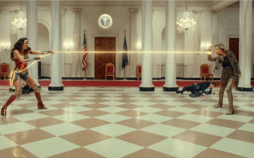 It’s baffling that a film set in the 1980s, fueled as they were by cocaine and Day-Glo synthetics, should take as its dominant tone the color beige. Color and shadow are drained out of nearly every scene leaving a bland, flat wasteland of boring dialogue and little emotion (though Pascal does his best to chew up all the scenery left untouched by Gadot, who never appears to be occupying the same space as the other actors). Clearly this color-scheme is intentional: a labored and unfunny montage of Pine in different 80s outfits ends in him dressed in light earth tones, while Pascal has his hair dyed dirty blonde and wears a beige suit throughout. It’s like going to the beach and staring at the sand. The highway chase, set in a Middle Eastern desert (maybe simply to remind people of Gadot’s IDF past?) is so monochrome it makes the dishwater gray finale of Endgame look vibrant. But even worse is the action itself, which feels absolutely weightless and frictionless: the stunts don’t thrill because nothing tangible actually touches anything else. Diana runs around, over, and through things with no substance, her lasso expands to whatever length the effect requires, a gold line on a computer screen, at one point contracting around a lightning bolt, the impossible physics of which would be cool if it didn’t so well epitomize the flashy nothingness of the movie’s stunts. It’s just all so boring.